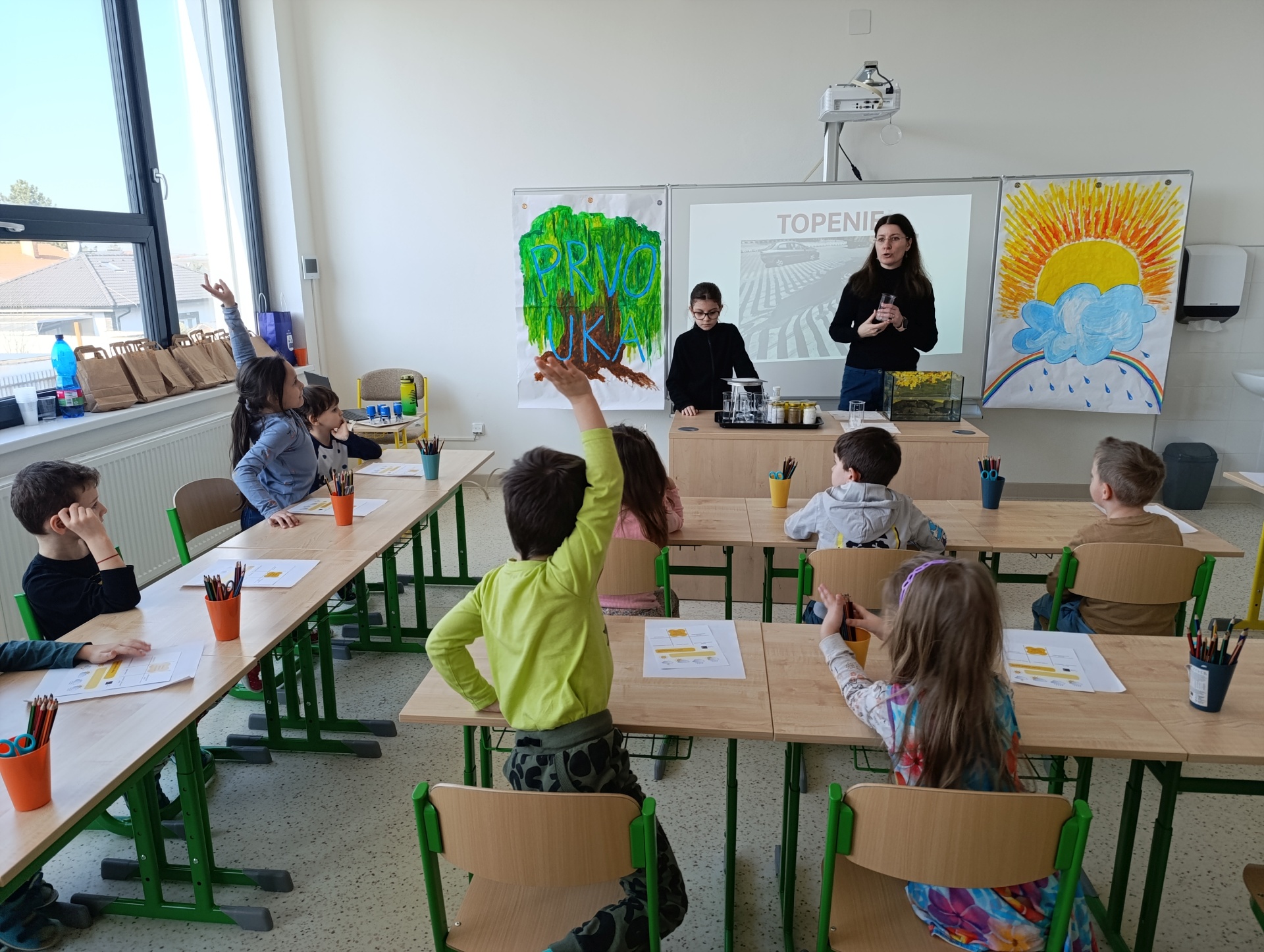 Deti zo škôlky sa v tomto týždni venovali téme „Povolania“, prišli sa preto zoznámiť s prácou učiteľa. Stali sa na chvíľu žiakmi a na hodine prvouky pracovali ukážkovo. Témou bolo topenie, rozpúšťanie, zdroje tepla a hustota. Súčasťou hodiny boli praktické úlohy zamerané na zahrievanie, topenie ľadu, plávajúce a neplávajúce predmety v akváriu s vodou. Deti zvládli odpovedať na otázky, správne identifikovať predmety na obrázkoch na tabuli, aj vypracovať na záver pracovný list k preberanej téme. Spoločne sme sa pomodlili v kaplnke a s darčekom spokojné odchádzali do škôlky.